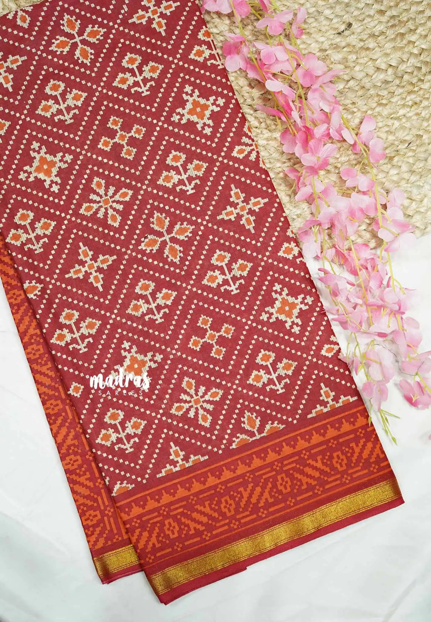 Soft Muslin cotton patola prints with tissue border - crimson red