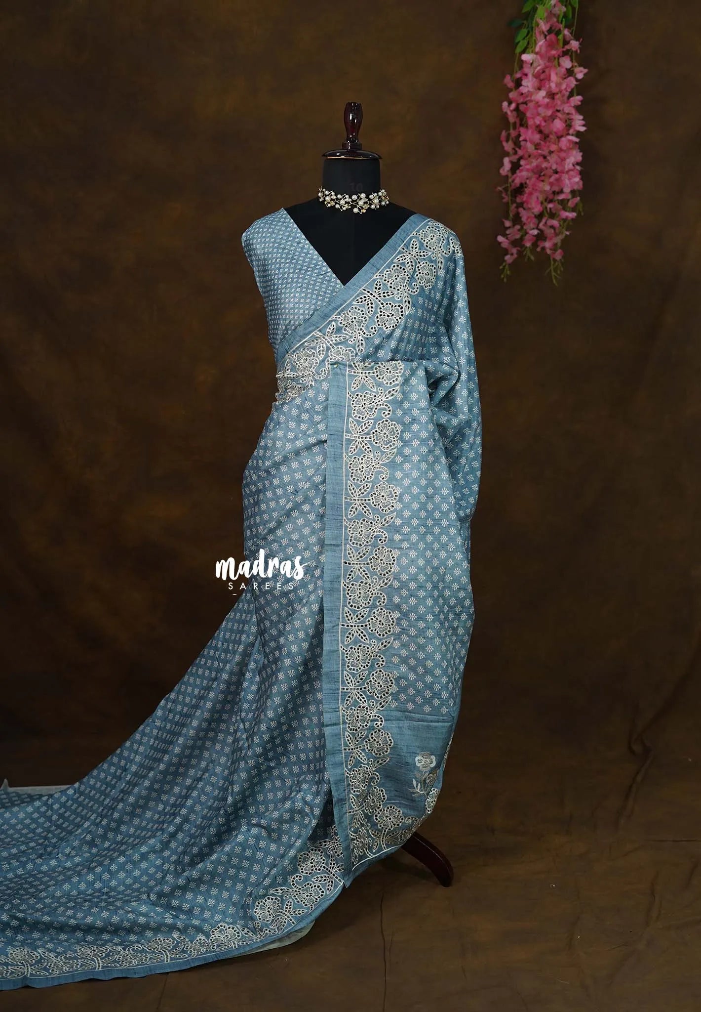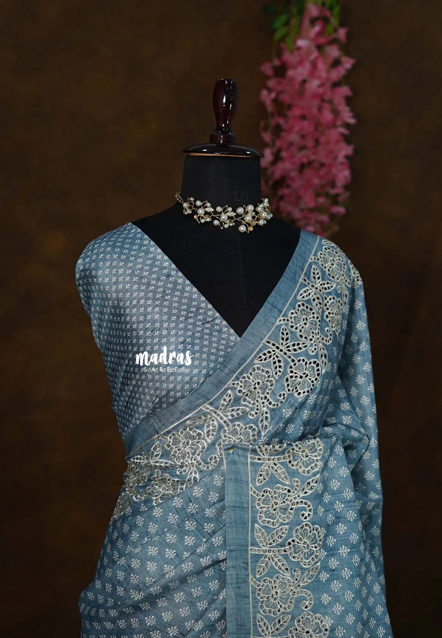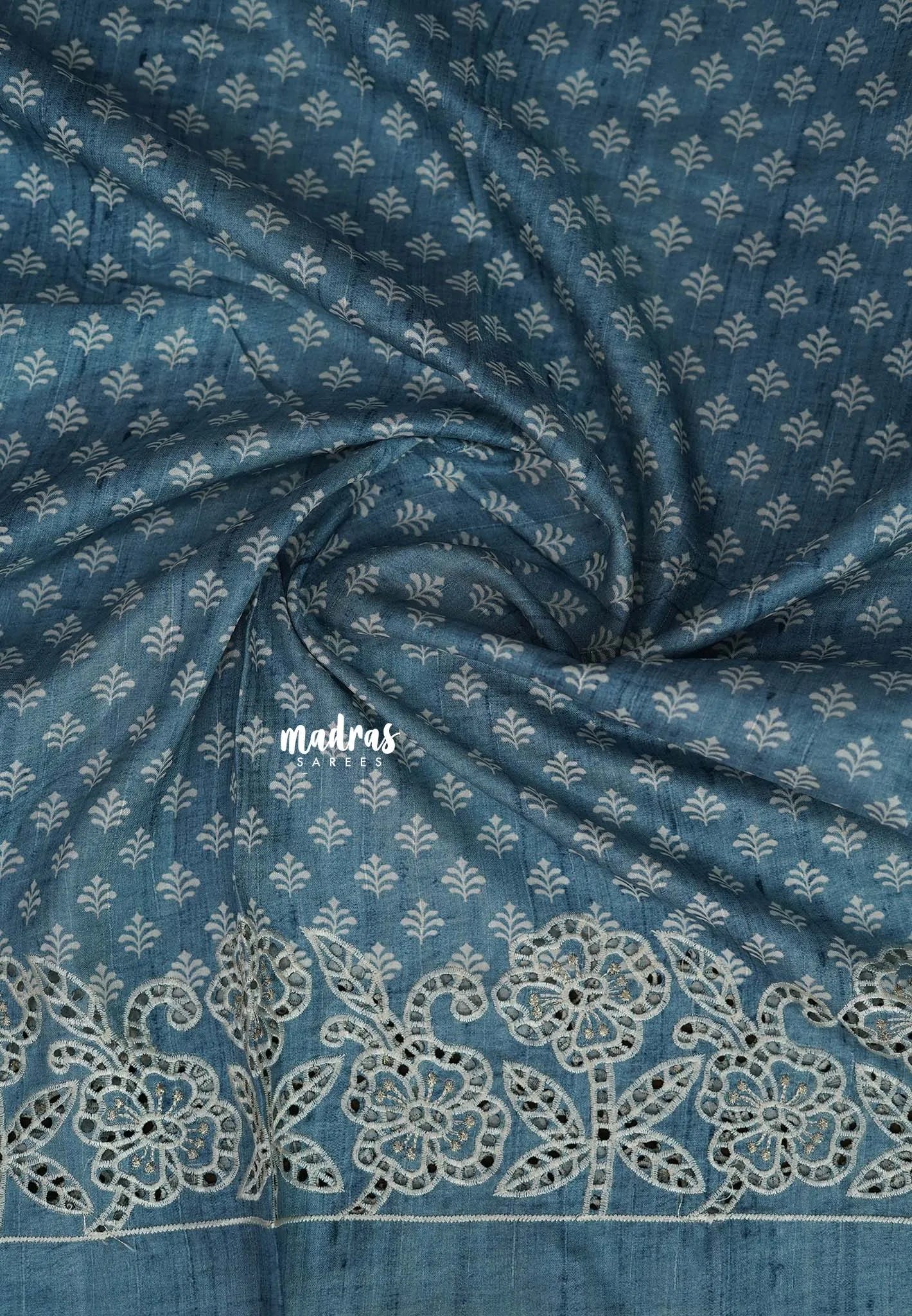 Steel Blue - Veena - Lightweight Semi tussar saree wtih floral cutwork border - Perfect for Office Wear