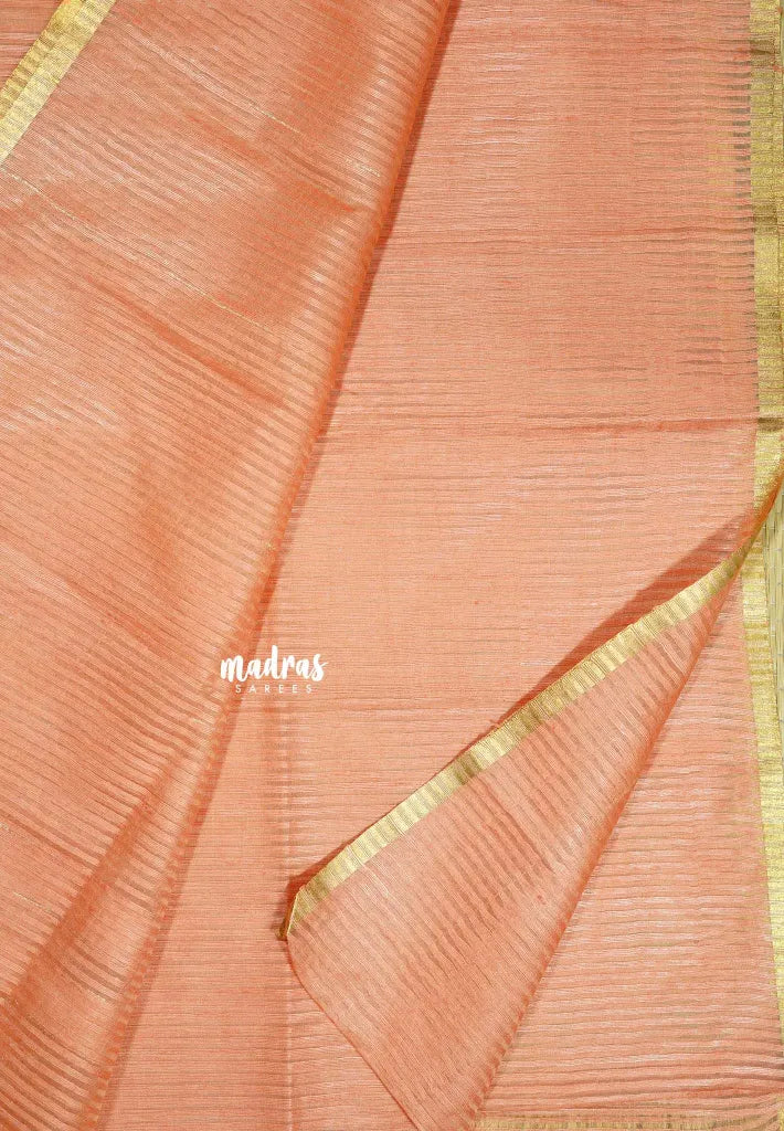 A graceful semi tussar saree featuring subtle textured stripes all over the body. The rich zari border adds a touch of elegance, making it perfect for both festive and classy occasions.