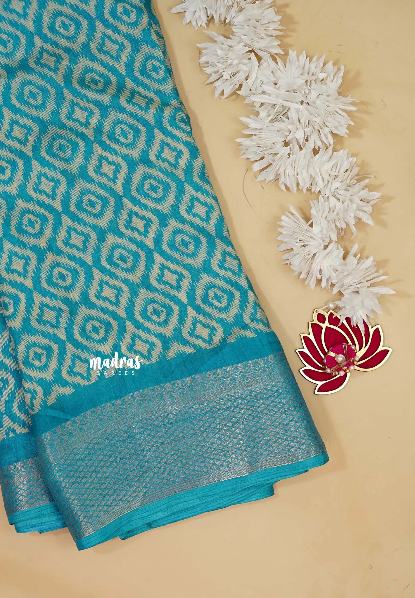 Teal Blue - Silky Georgette with Ikkat Prints and Zari Border
