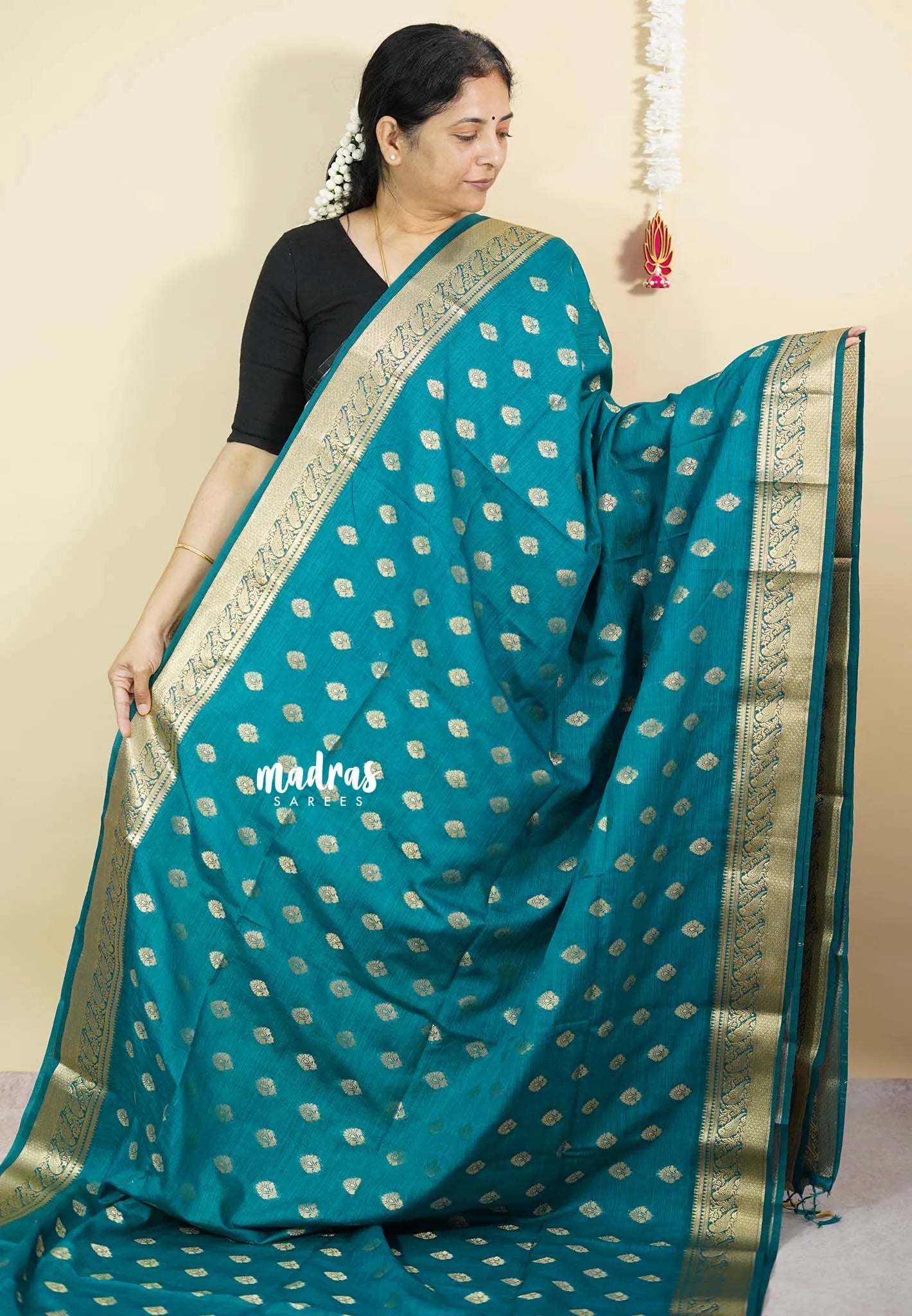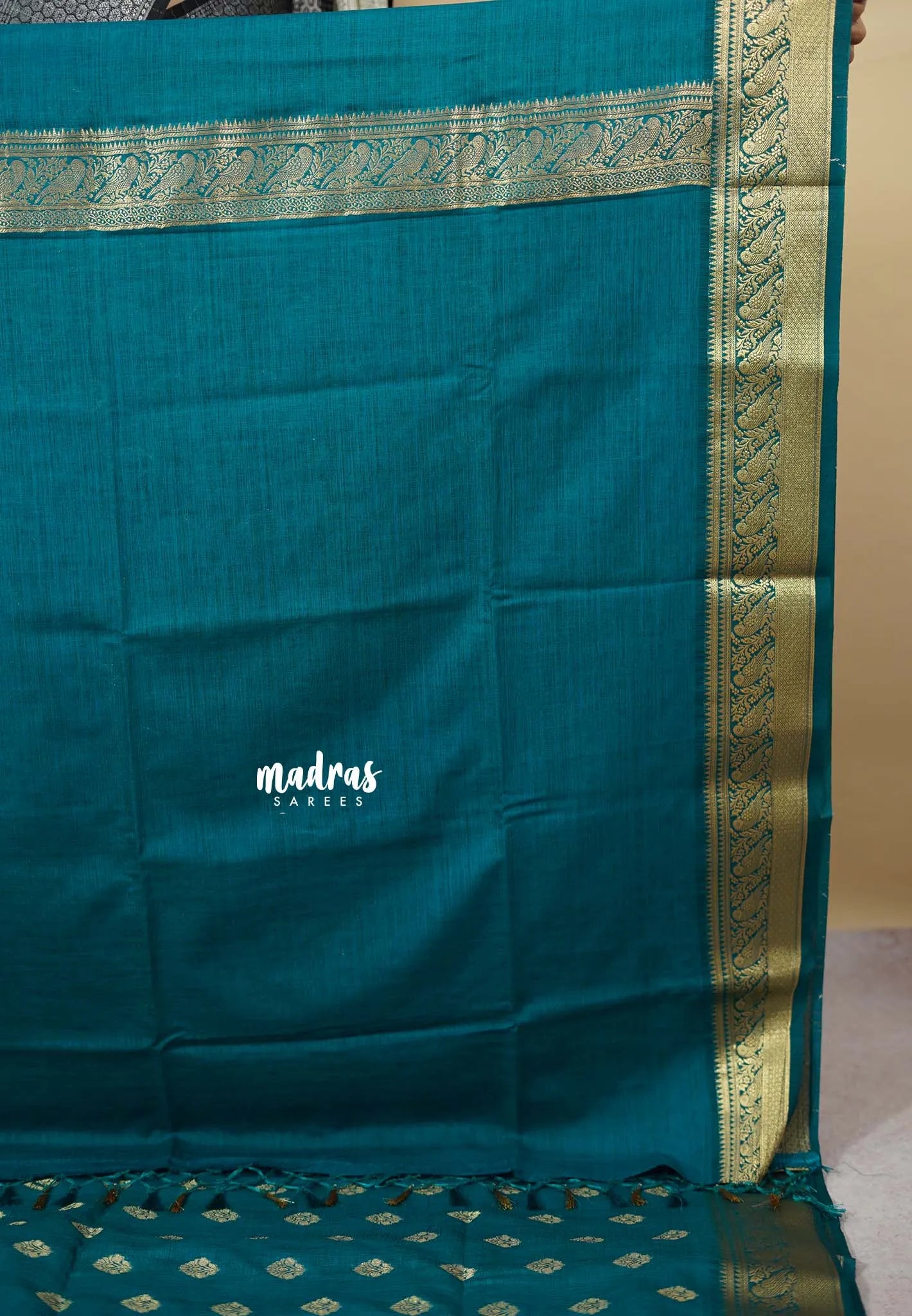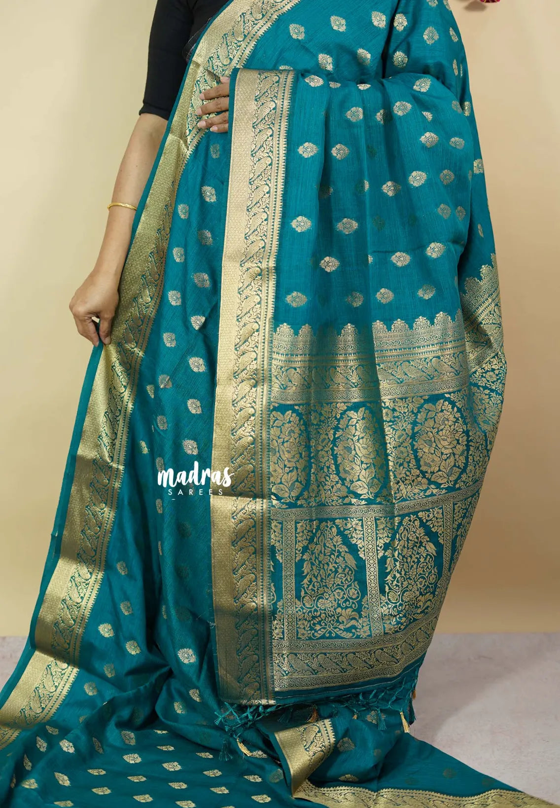Teal Blue - Vadhanam - Premium Jute Tussar silkwith buttas and gold zari border