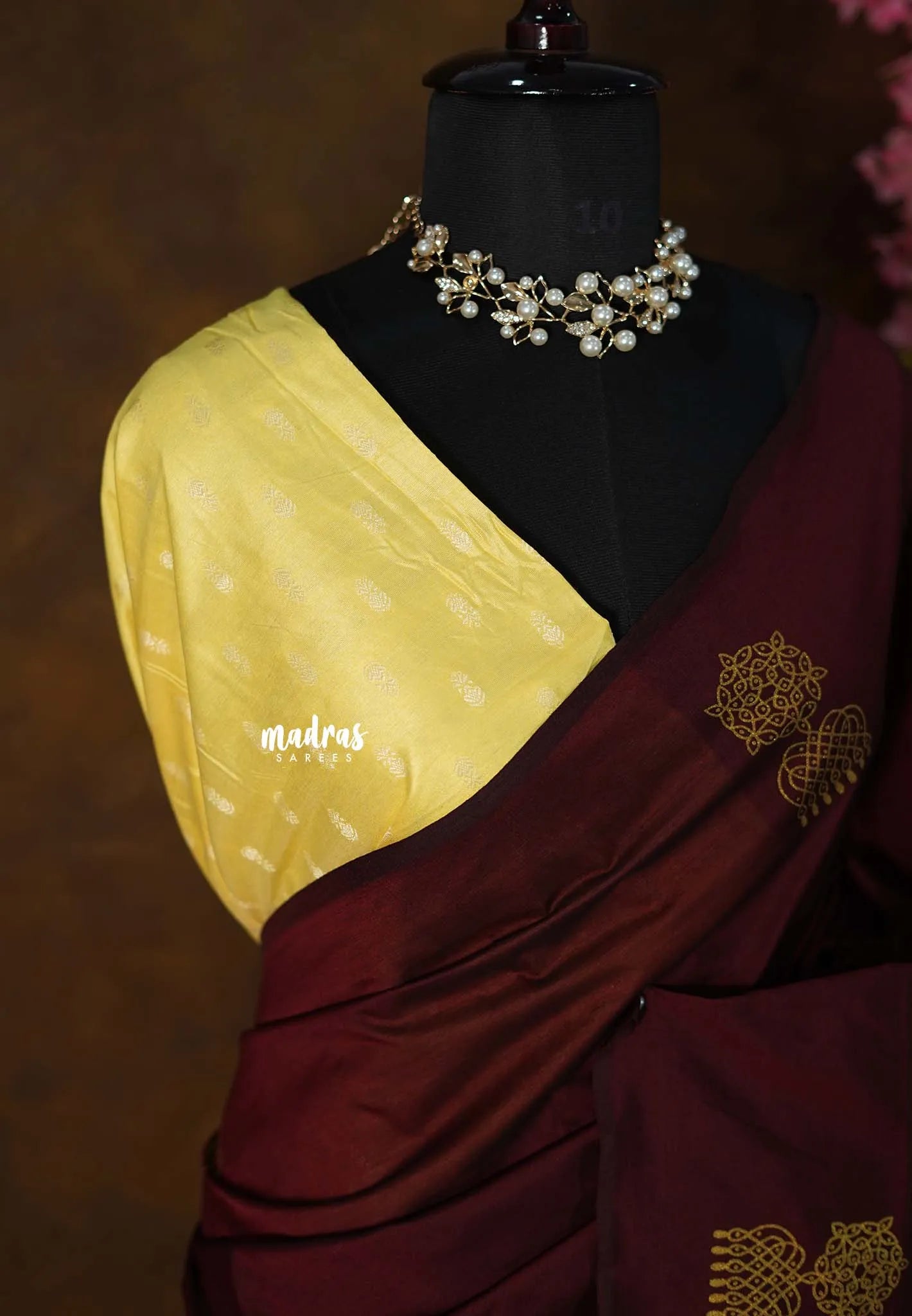 This elegant Sowmiya bamboo cotton saree is beautifully adorned with traditional gold kolam handblock prints, reflecting timeless South Indian artistry. The bamboo cotton fabric is exceptionally soft, breathable, and lightweight, ensuring all-day comfort with a graceful drape. The subtle sheen of the gold motifs adds a refined festive touch, making it perfect for office wear, cultural gatherings, temple visits, and simple celebrations. A perfect blend of tradition, comfort, and understated elegance.