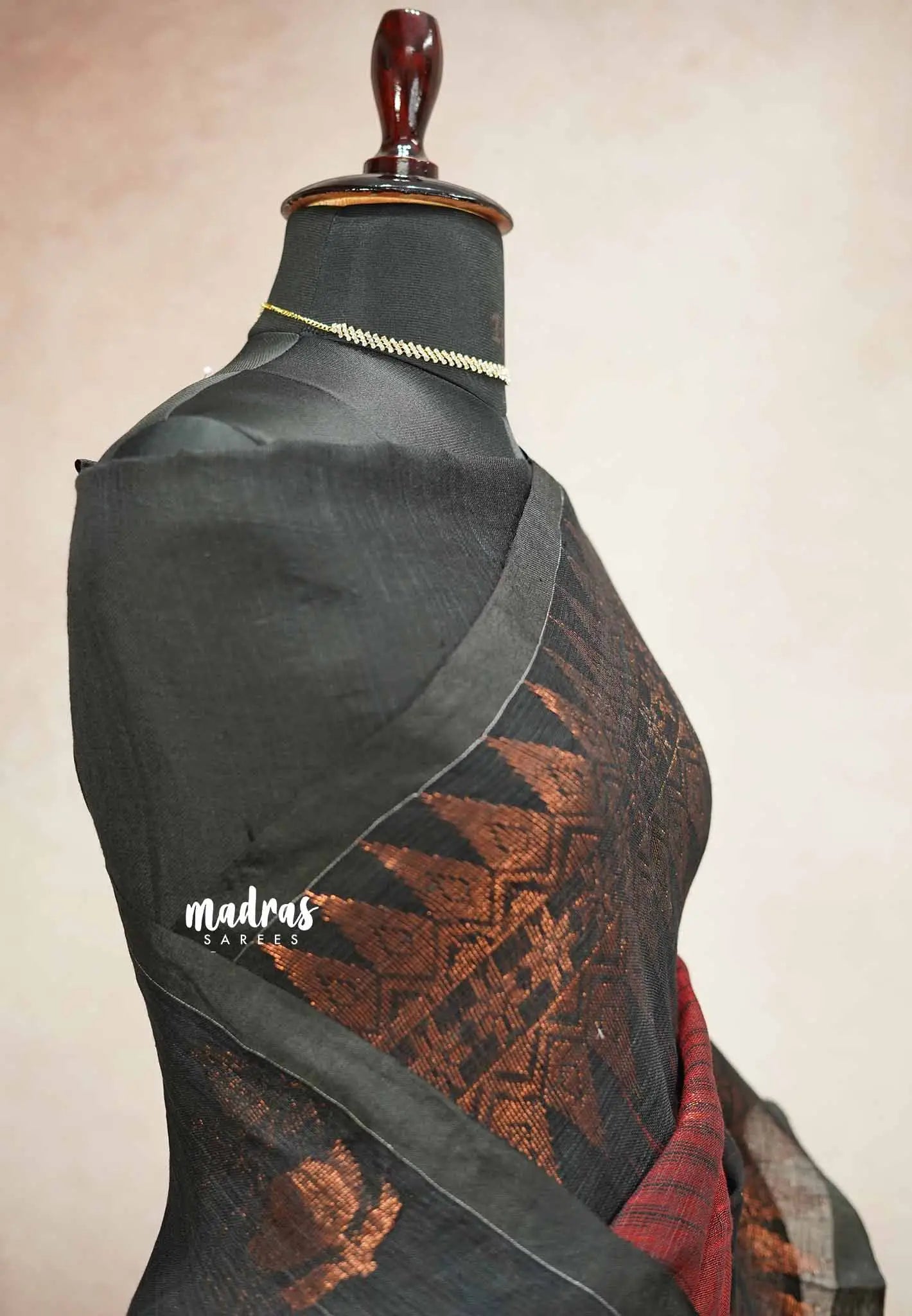 Embrace timeless elegance with our Pure Linen Saree, featuring a traditional and delicate copper zari border. The Ikkat work on the border adds an artistic touch, while the black pallu with lotus motifs enhances its beauty. Perfect for cultural events, festive celebrations, or elegant soirées, this saree offers a blend of tradition and sophistication for the modern woman.