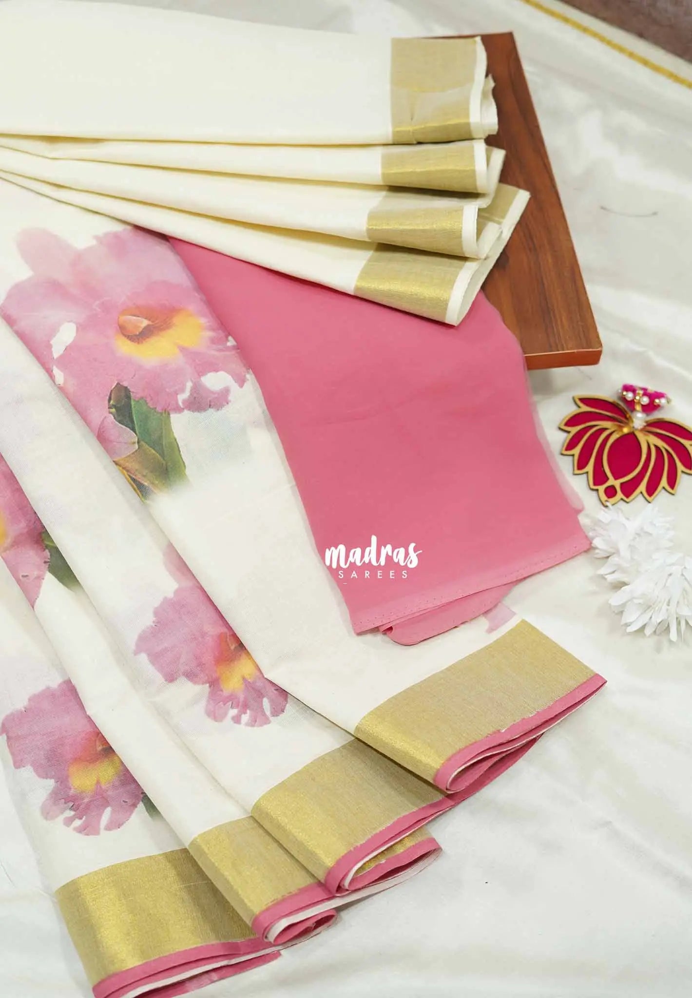 An elegant blend of tradition and modern flair—off-white base adorned with vibrant floral digital prints and rich kasavu zari borders.