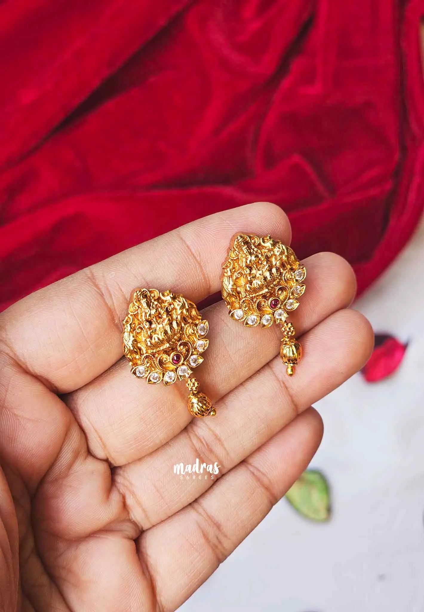 Adorned with intricate carvings of Goddess Lakshmi, these antique gold-toned earrings exude divine charm. Accented with ruby and emerald stones, they’re perfect for traditional and festive occasions.