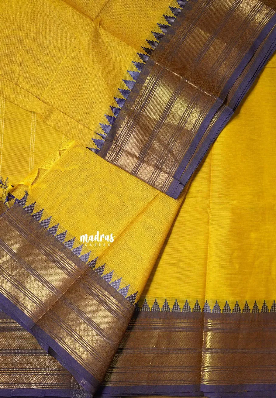 Turmeric Yellow - Karthigai Silk Cotton Bavanji with Temple Border - Best for Wedding Functions