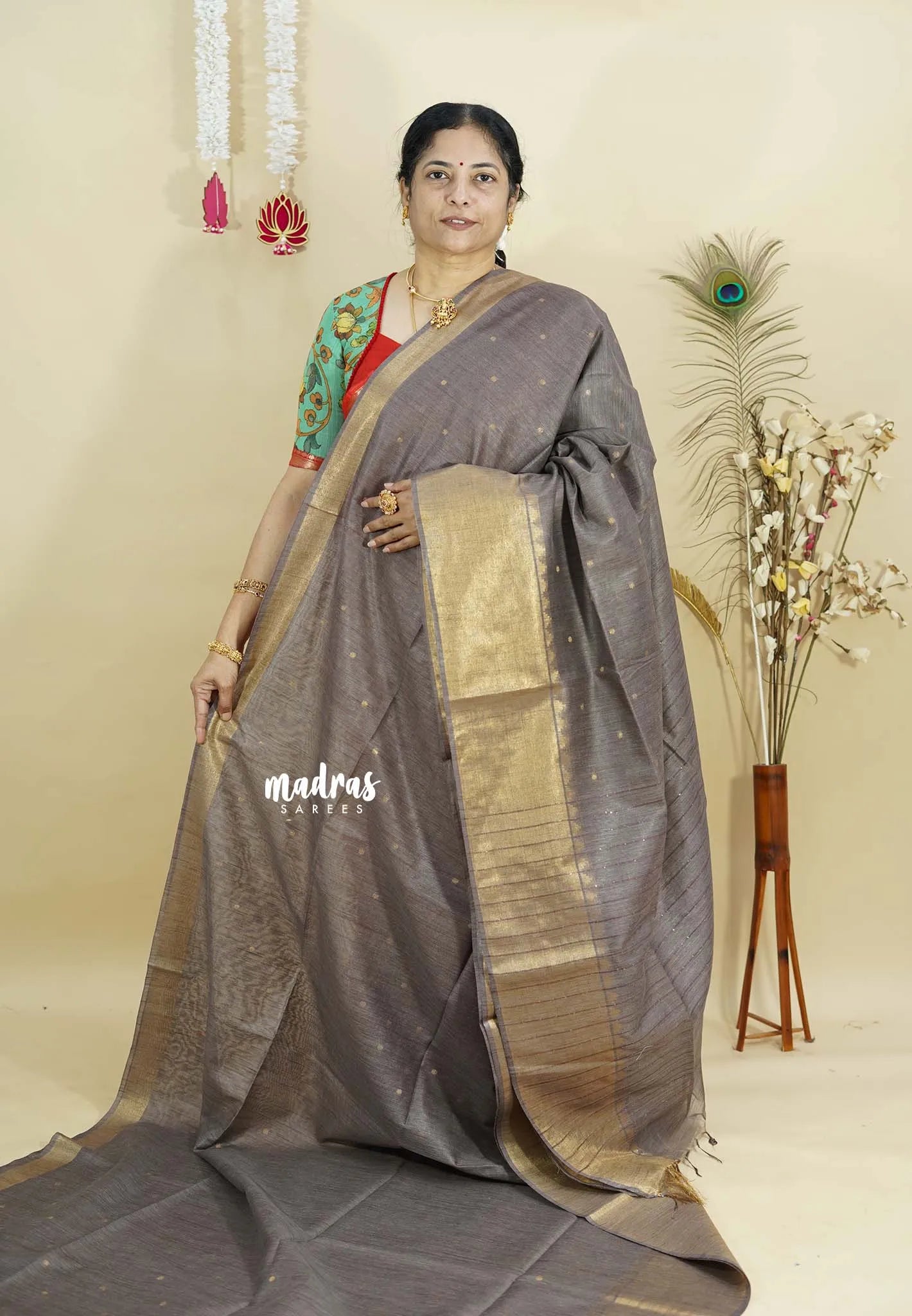 A semi-Tussar saree is made from a blend of Tussar silk and other fabrics, offering a lighter and more affordable alternative to pure Tussar silk. It has a natural sheen, soft texture, and is known for its elegant drape, making it perfect for both casual and festive occasions. Its intricate weaving and vibrant designs make it a versatile, timeless piece.