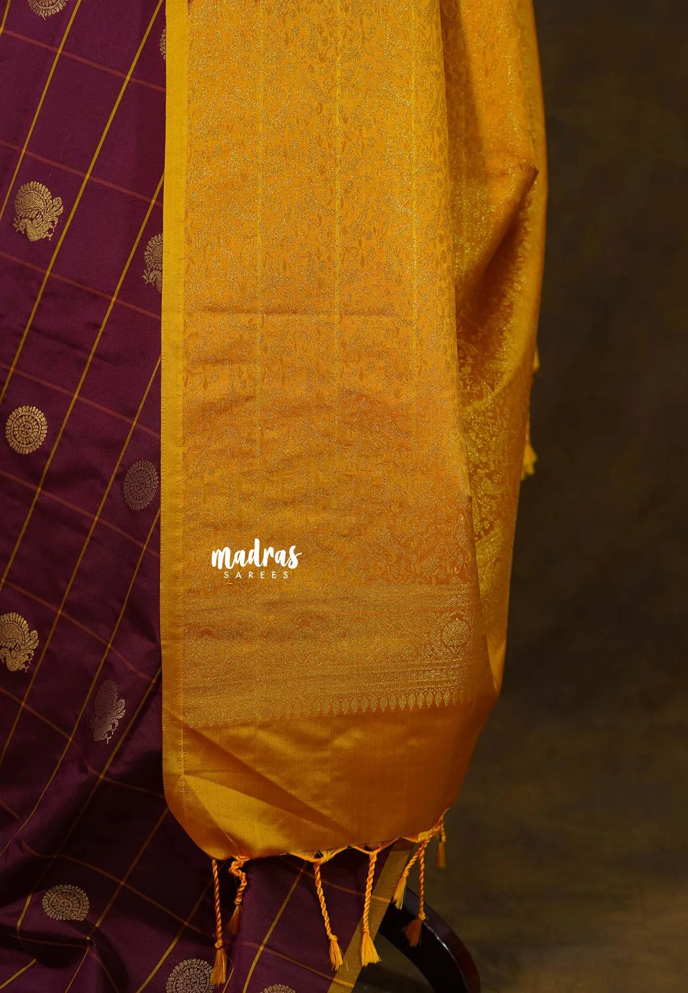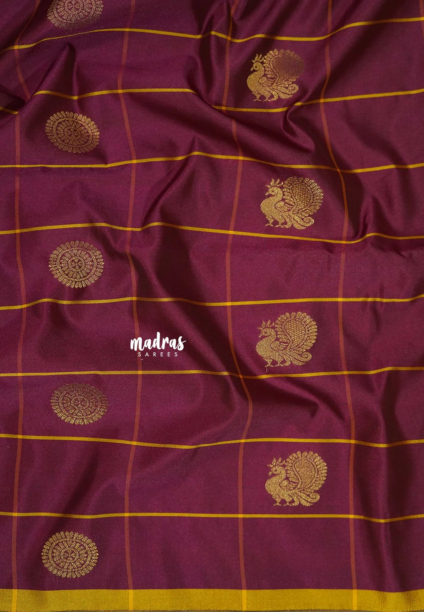 A graceful drape, Hamsavalli features delicate zari checks adorned with traditional peacock and rudraksham motifs. Woven in soft silk, this saree is a perfect blend of heritage charm and contemporary finesse — ideal for festive occasions and timeless celebrations.