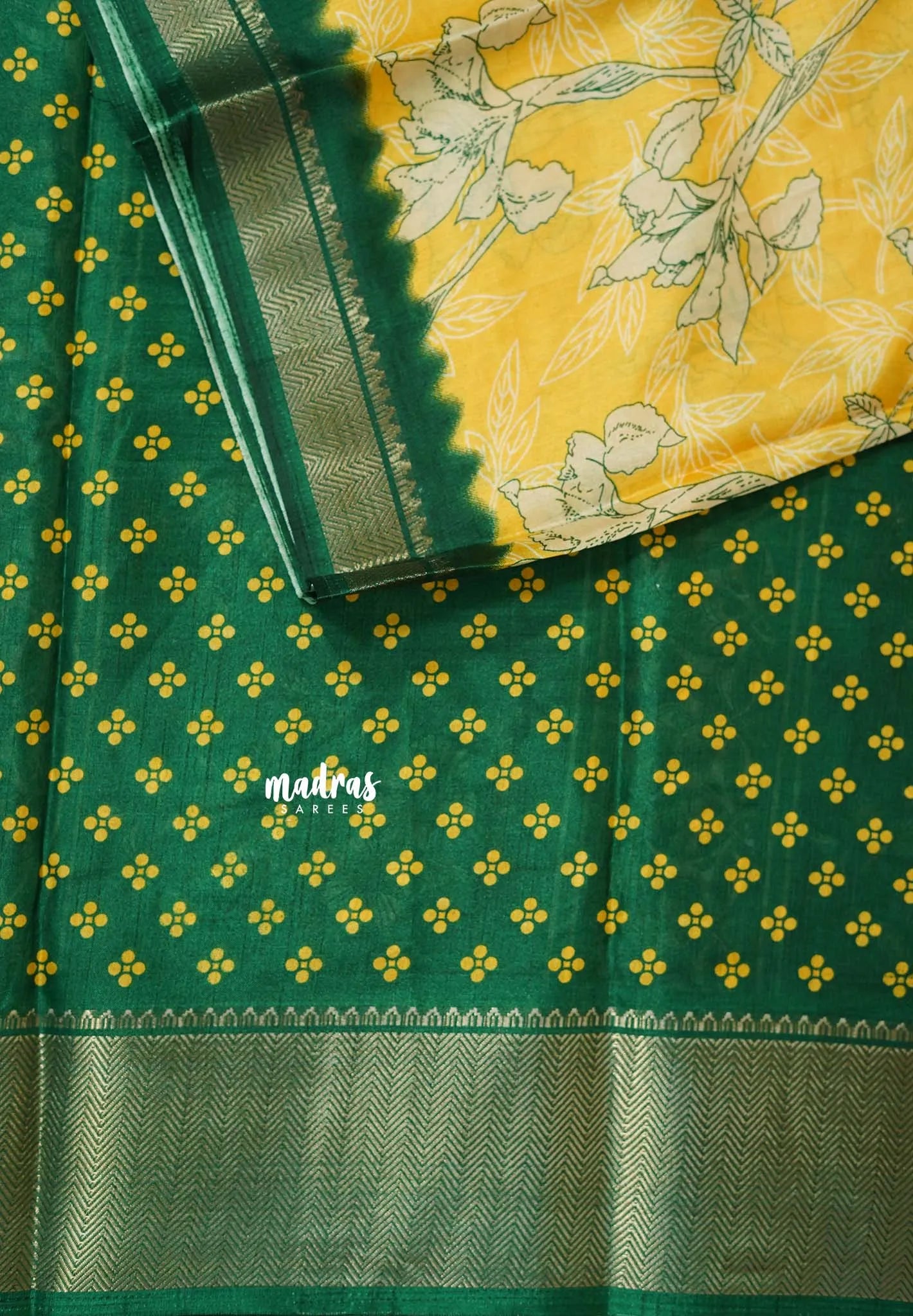 Exquisite floral-printed silk saree featuring a deep, regal base adorned with blooming pastel flowers. Its rich mustard-gold zari border adds a striking touch of opulence, making it perfect for elegant occasions.