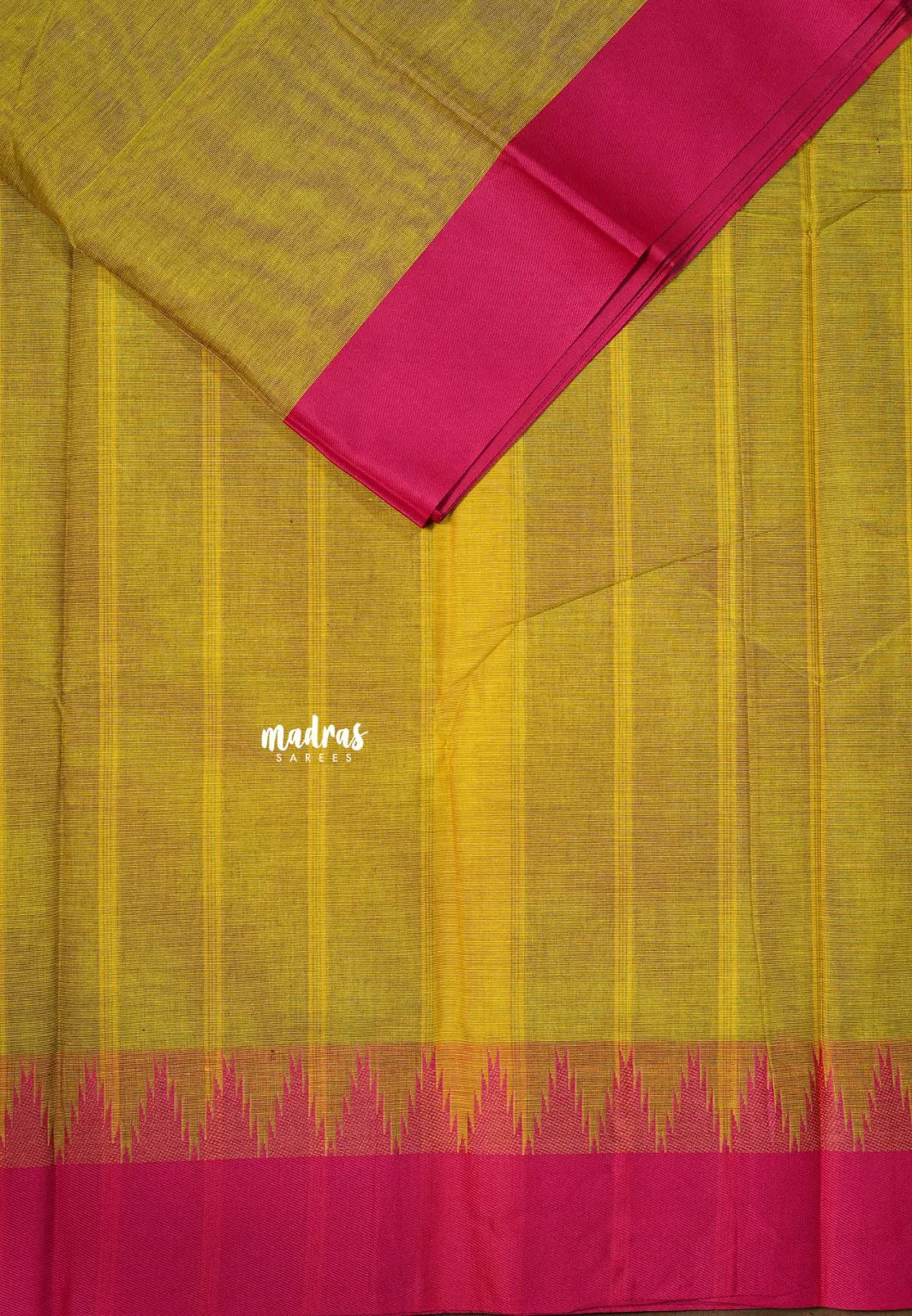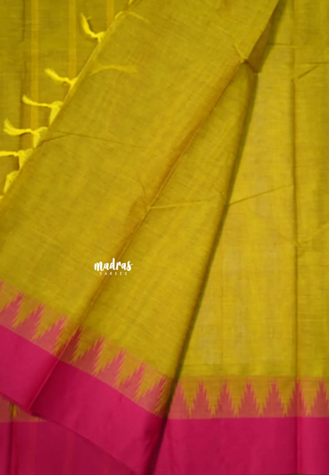 Yellowish Green - Karthigai silk cotton plain body with plain border with temple - Best for Gifting